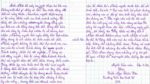 "Tôi ra đề này vì muốn cho các cháu luyện viết văn. Cũng để các cháu nắm được những thông tin thời sự, thể hiện tình cảm, hỏi han các bạn ở Nhật .Các cháu mới từ lớp 2 lên cần tập viết và rèn luyện thêm. Đây là bài tập để rèn luyện cách viết văn, thể hiện cảm xúc chứ không chấm về cách trình bày như văn lớp 4" - cô giáo Trang, chủ nhiệm lớp chủ nhiệm lớp 3A1, Trường Tiểu học Lê Qúy Đôn nói về đề văn "thời sự".