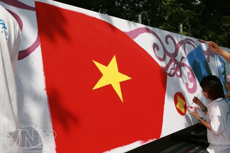 | Các bạn trẻ tham gia vẽ hình cổ động. Nguồn ảnh:vnanet |