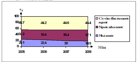Biểu đồ thể hiện sự thay đổi cơ cấu giá trị sản xuất công nghiệp ở nước ta phân theo thành phần kinh tế từ năm 2005 đến năm 2008 |