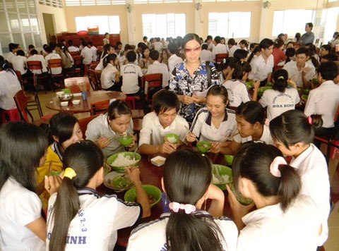 | Đây là quang cảnh buổi ăn trưa của gần 230 TS của THPT Hòa Bình và Phổ thông Dân tộc Nội trú tỉnh Vĩnh Long tại nhà ăn của trường nội trú. Từ vận động xã hội hóa, đóng góp của TS có nhu cầu và hỗ trợ của UBND huyện Tam Bình, bữa ăn trưa cho tiện lợi, an toàn vệ sinh, bữa ăn thật rôm rả và rất ngon |