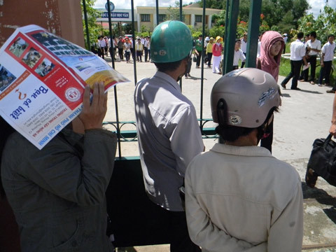 | TS tại hội đồng coi thi THPT Vĩnh Long đọ lại kết quả bài làm sau khi thi xong môn Toán. |
