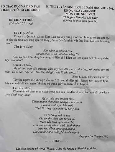- Đề thi Ngữ văn trong kỳ thi tuyển sinh vào lớp 10 năm học 2011 - 2012 của TP.HCM có 4 câu, còn đề thi của Hà Nội có 2 câu. Đáng lưu ý, trong phần yêu cầu viết đoạn văn tự luận, đều trích dẫn các tác phẩm là lời tự sự của người cha, người mẹ.