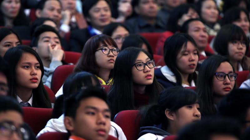Buổi giới thiệu nội dung đổi mới chương trình giáo dục phổ thông với sinh viên Trường ĐH Sư phạm Hà Nội. Ảnh: Kim Khang