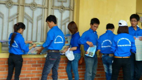 | Từ sáng sớm đội sinh viên đã có mặt tại bến xe để hướng dẫn, chỉ đường cho các sĩ tử từ xa đến |