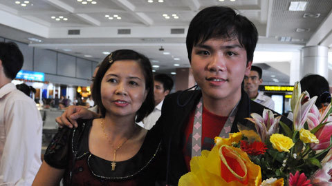 Nguyễn Huy Hoàng hạnh phúc khi mang được tấm HCV về cho đoàn Vật lý. Trong ảnh: Hoàng chụp chung với mẹ tại sân bay Nội Bài, chiều 18/7. |