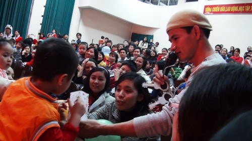 Diễn viên Xuân Bắc trao quà cho trẻ trong một buổi đón Giáng sinh