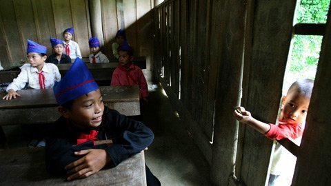 hiện nay vẫn phải học trong những lớp học bằng tranh tre, nứa lá xập xệ