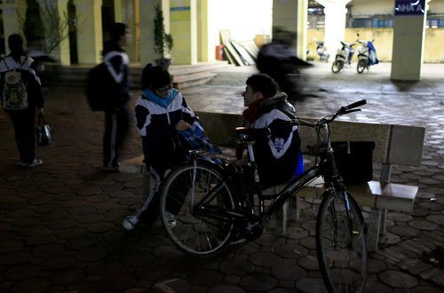 Hình ảnh mới ở Hà Nội: Học sinh tung tăng tan trường trong ánh đèn đường.