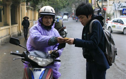 Một học sinh lớp 10 trường Chu Văn An vừa trả tiền bác xe ôm. Có học sinh cho biết: Bố, mẹ em đã hợp đồng với bác xe ôm đầu ngõ để đưa em đến lớp bắt đầu từ hôm qua, tối thì bố mẹ đón về.