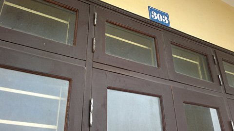 | Phòng 303, kí túc Trường THPT Lê Hồng Phong cửa đã đóng, 7 em còn lại của phòng này đã được gia đình cho về nhà để ổn định tâm lí. |