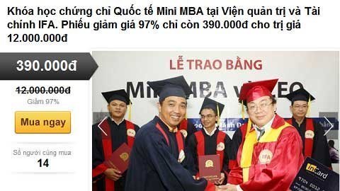 Khóa học mini đào tạo theo chương trình MBA thế giới về mô hình kinh doanh mới, những kiến thức tổ chức, quản lý doanh nghiệp được quảng cáo trên một trang bán hàng qua mạng chỉ với giá 390 nghìn đồng. Đây là chi phí quá “sốc” so với mức giá gốc 12 triệu đồng/ khóa. Anh Tùng Linh (Từ Liêm, Hà Nội) từng tham gia khóa học này chia sẻ thêm: “ Tôi theo học thạc sỹ quản trị kinh doanh với hình thức distance learning (đào tạo từ xa) còn được hỗ trợ đến 40 triệu đồng kết hợp 1 chuyến du học tại Malaysia 4 ngày. Chi phí rẻ nhưng giá trị thực là những con số ảo nên mình không thể định lượng được, vì nếu tính theo mức giá này có lẽ trung tâm phá sản”.