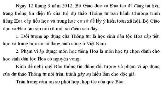 Theo dự thảo, nếu được đồng thuận, tiếng Hoa sẽ được đưa vào giảng dạy ở hai cấp học này với số lượng 4 tiết/tuần.