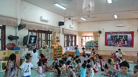 Trong khi đó, tại Trường mầm non Kim Liên, quận Đống Đa, các phòng chỉ được trang bị hệ thống quạt trần. Theo hiệu trưởng Nguyễn Thị Minh Nguyệt: “Khuôn viên trường nhiều cây xanh nên rất mát.