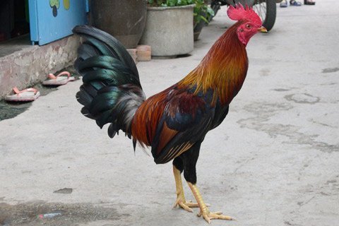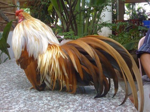 | Một chú gà được xưng vương trong một cuộc thi. Tiêu chuẩn của một gà trống cảnh đẹp nhất là phải có một bộ lông đẹp, đuôi dài, đôi chân thấp, dáng cân xứng, cánh che hết thân. Khi chú di chuyển, người xem sẽ cảm tưởng chú như một bông hoa đang đứng trên “sân khấu”. Nguồn: VTC news. |