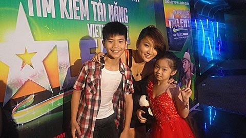 | Quỳnh Trang (ở giữa) và hai học trò nhí Đăng Quân – Bảo Ngọc vui vẻ trong đêm thi chung kết VN’s got talent 2012 (Ảnh do nhân vật cung cấp). |