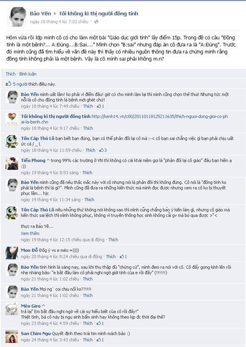 (Ngày 19/4)Mình cũng đã nêu thắc mắc này với cô nhưng nói là phản đối thì không đúng. Cô nói là "đồng tính không phải là bệnh thì là gì?". Mình cũng đã đưa ra những kiến thức mà mình đọc được nhưng xem ra cô không bị thuyết phục lắm...