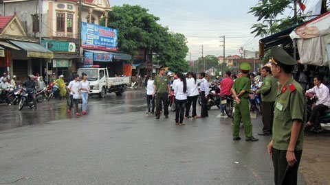 | Lực lượng chức năng được huy động để ổn định trước điểm thi trường THPT Nam Đàn 1. |