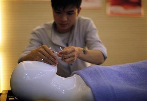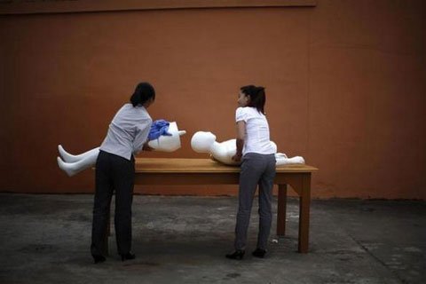 | Các sinh viên của Dịch vụ Tang lễ Tianquanjiajing cúi đầu trước ma-nơ-canh nhựa khi họ bắt đầu khóa học |