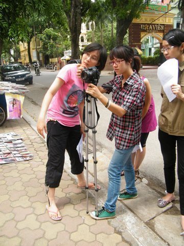 | Hà Thái (người mặc áo kẻ) cùng nhóm làm phim của mình |