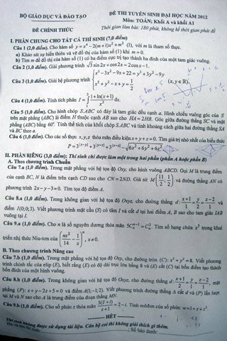 | Đề thi ĐH môn Toán năm 2012 |
