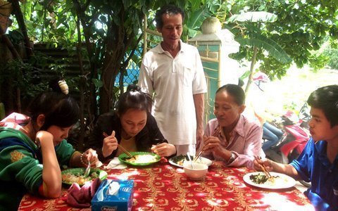 | Ông Đặng Chư (đứng) hỏi thăm thí sinh và người nhà trong lúc dùng cơm (Ảnh: Phan Thành/Tuổi trẻ). |