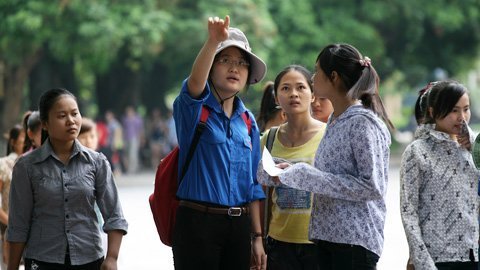 Thí sinh được sinh viên tình nguyện chỉ đường tới phòng thi |