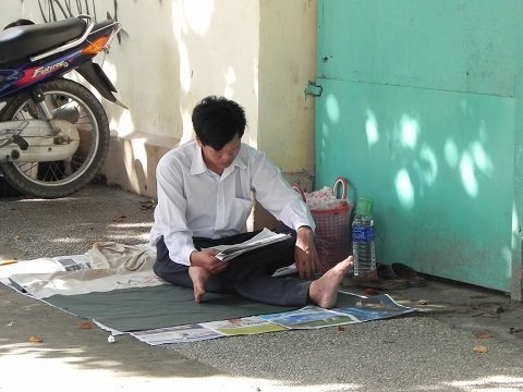 Trải áo mưa để nghỉ ngơi trong lúc đợi con thi xong. Ảnh Hiểu Minh |