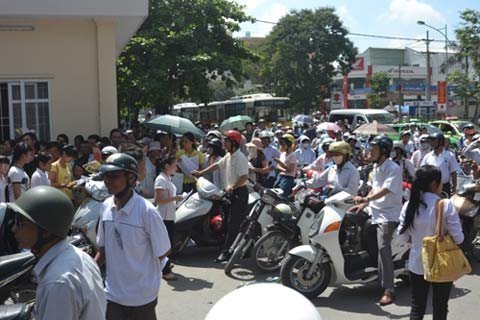 Khi thí sinh tan giờ thi, nhiều tuyến đường ở các cổng Trường Đại học Giao thông vận tải, Học viện Báo chí, Đại học Sư phạm Hà Nội… ùn tắc cục bộ. Ảnh Anh Tuấn |