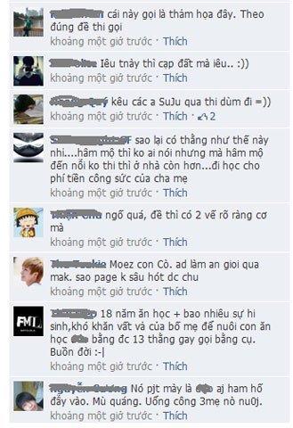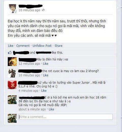 “ĐH không thi năm nay thì thi năm sau, trượt thì thôi, nhưng tình yêu của mình dành cho SuJu nó gọi là mãi mãi, vĩnh viễn không thay đổi. Mình xin đảm bảo điều đó...”. Cho rằng đề thi ĐH ảnh hưởng đến tình yêu của mình dành cho thần tượng, U94 này quyết định “nghỉ làm” để đảm bảo tình cảm. Đứng trước thần tượng, kì thi ĐH bỗng trở nên vô nghĩa?