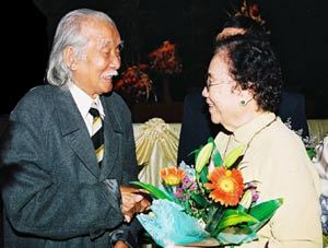 | GS Vũ Đình Hoè (năm 95 tuổi) và nguyên Bộ trưởng Bộ GD Nguyễn Thị Bình. Ảnh: Bùi Tuấn |
