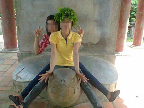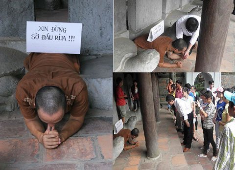 Trong khi các nam thanh nữ tú đua nhau tạo dáng bên đầu rùa vô cùng phản cảm thì lại xuất hiện những bức ảnh rất lạ chụp một nam thanh niên quỳ gối, còng lưng giống như rùa đá với một tấm biển ghi “Xin đừng sờ đầu rùa!!!” đặt trên lưng.
