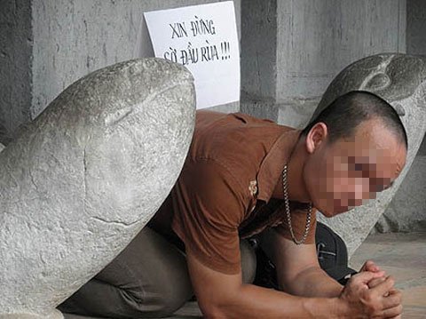 Không biết có phải vì quá bất bình trước những cảnh chen nhau sờ đầu rùa ở Văn Miếu mà chàng trai đã có hành động kì lạ này hay không?