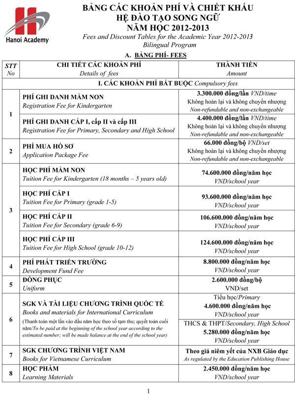 Tại Trường quốc tế Việt Úc, phụ huynh còn phải đóng phí dự tuyển 1.050.000 đồng (tiểu học) và 2,1 triệu đồng (THCS, THPT) rồi phí giữ chỗ 10.500.000 đồng. Trường tiểu học Hà Nội Academy lại có khoản phí đăng ký cho năm học kế tiếp từ 4,5 triệu-7 triệu đồng tùy cấp học, rồi phí mua hồ sơ, phí ghi danh cũng từ vài trăm tới vài triệu đồng/lần.