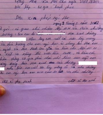 Nguyên văn nội dung đơn: “Hôm lay, em viết cái Đơn lày mong cô và nhà trường cho em ngỉ học vì chong lúc Học em quá đùa nghích và Học Hành còn yếu và làm cho lớp 10H xa xút và không thể vươn lên Được, và làm cho nhiều thầy cô gia phải nhác nhở lên em ngĩ em không xứng Đáng làm học sinh của chường…”