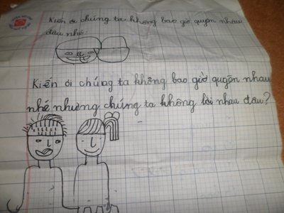 Con thích bạn Yến Vi ở lớp, thích cả mẹ bạn ý nữa vì mẹ bạn ý xinh lại hay mua bim bim siêu nhân cho con”. Bé bày tỏ rất tự nhiên rồi rành rọt nhờ mình viết “Tớ thích cậu lắm. Tớ không thích Trung “còm” ngồi vẽ cạnh cậu đâu. Tớ sẽ nhờ mẹ tớ mua bờm tóc tặng cậu, cậu hứa ngồi cạnh tớ nhé”.