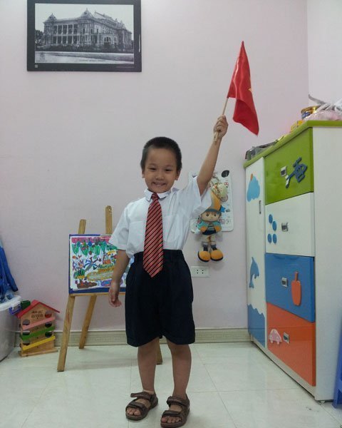 | Dù chiều nay nhà trường mới tổ chức khai giảng, nhưng bé Khôi đã vận đồ từ sáng sớm phất cờ ở trong nhà |