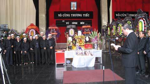 Đọc điếu văn đưa tiễn cụ Vũ Đình Hoè, Phó Thủ tướng Chính phủ Nguyễn Thiện Nhân, trưởng ban tang lễ nhắc lại: