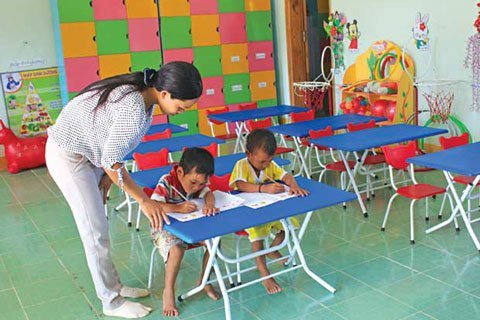 Lớp học mẫu giáo ở điểm chính trường mẫu giáo Hoa Phượng chiều 24.9 chỉ có hai học sinh. Ảnh: Phạm Anh