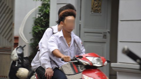 | Với nhiều học sinh nam, “phong cách” thời trang là phải áo phanh ngực, đầu nhuộm màu, tóc dựng ngược, không đội mũ bảo hiểm khi điều khiển xe máy tới trường (?!) |