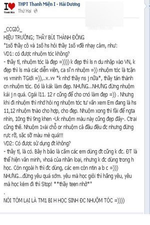 Những ngày qua tại Trường THPT Thanh Miện 1, huyện Thanh Miện, Hải Dương và trên facebook học sinh của trường xôn xao bởi phát biểu trong lễ chào cờ của hiệu trưởng Bùi Thành Đông rằng “học sinh có thể nhuộm tóc cũng như dùng di động khi ở trường”.