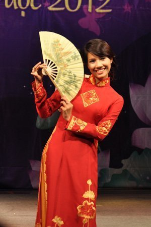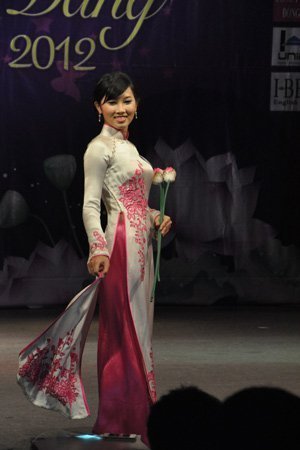| Các thí sinh duyên dáng trong phần thi trang phục áo dài truyền thống. |