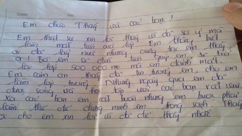 Em thật sự xin lỗi thầy vì đã sơ ý mà làm mất tiền của lớp. Em không biết ai đã lấy nữa nhưng cũng tại em thầy ạ! Bố em sẽ đền tiền giúp em, sẽ trả lại lớp 500.000 đồng mà em đánh mất. Em cảm ơn thầy đã tin tưởng em, cho em làm lớp trưởng. Những ngày qua em, đã được sống và học tập với các bạn rất vui. Xa các bạn, em rất buồn nhưng buộc phải làm thế để chứng minh em trong sạch. Thầy ơi cho em xin lỗi vì đã để thầy nhắc”.