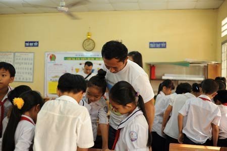 | Ông Ngô Văn Huy- Tổng giám đốc công ty điện tử Philips Việt Nam cùng tham gia nhóm giải đố về tháp dinh dưỡng với các em học sinh tại trường Bình Lợi, Bình Chánh. |