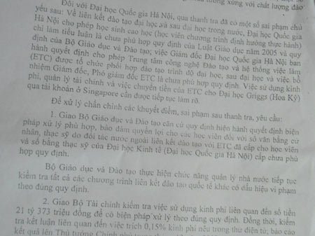 Đối với ĐHQG Hà Nội, qua thanh tra đã có một số sai phạm chủ yếu sau: Về việc liên kết đào tạo ĐH và sau ĐH trong nước, ĐHQG Hà Nội cho phép học viên cao học (học viên chương trình định hướng thực hành) chỉ làm tiểu luận là chưa phù hợp với quy định của Luật Giáo dục năm 2005 và quy định của Bộ GD-ĐT; Việc giám đốc ĐHQG Hà Nội ban hành quyết định cho phép Trung tâm công nghệ Đào tạo và hệ thống việc làm (ETC) được tổ chức phối hợp đào tạo trình độ ĐH, sau ĐH và việc bổ nhiệm Giám đốc, Phó giám đốc ETC là chưa phù hợp quy định. Việc sử dụng kinh phí, quản lý tài chính và việc chuyển tiền của ETC cho ĐH Griggs (Hoa Kỳ) qua tài khoản ở Singapore cần được tiếp tục làm rõ.