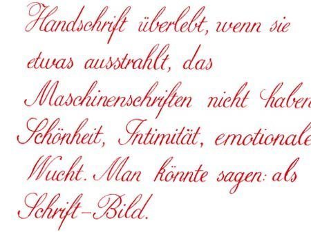 "Trước đây, trẻ em ở trường tiểu học có tám giờ tiếng Đức một tuần, trong đó hai đến ba giờ dành cho luyện viết chữ đẹp. Hiện tại chỉ cần có năm. Viết chữ thời nay được dùng trong ngữ cảnh khác. Từ mục đích viết chữ cho đẹp, nay viết chỉ được coi là phương tiện. Kiểu chữ cơ bản mới có đủ tính năng đó: rõ ràng, cho phép tự do cá nhân, nhanh hơn và không bị đau cơ bắp (do nắn nót, tập trung) khi học viết.