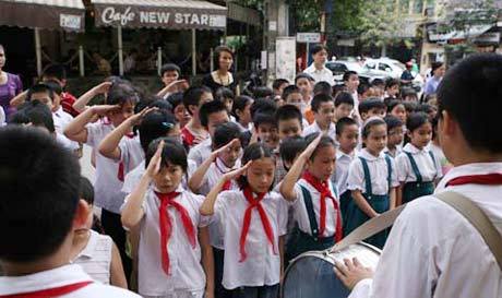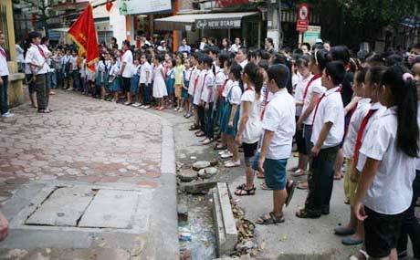 | Đất nội đô để xây trường học phổ thông hiện còn thiếu, học sinh phải chào cờ dưới lòng đường. Ảnh: Phạm Hải. |