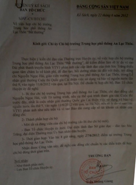 Công văn đề nghị kiểm điểm thầy giáo Trường THPT An Lạc Thôn, (Sóc Trăng).