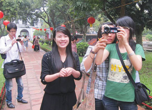 | Nhóm bạn trẻ ghi hình tại Văn miếu - Quốc Tử Giám - Ảnh: L.Hoa |