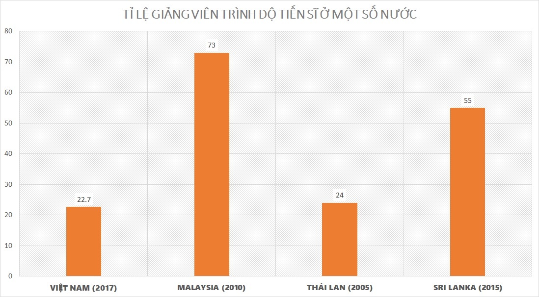 Theo số liệu của Bộ Giáo dục Sri Lanka , tỷ lệ tiến sĩ trên tổng số giảng viên của các trường đại học nước này năm 2015 là hơn 55%. Tỷ lệ giảng viên có trình độ tiến sĩ tại Thái Lan năm 2005 là hơn 24% . Tỷ lệ giảng viên có trình độ tiến sĩ tại các trường đại học nghiên cứu của Malaysia năm 2010 là 73% . Tại đa số trường đại học trên thế giới, có bằng tiến sĩ là một trong những yêu cầu bắt buộc đối với giảng viên. |