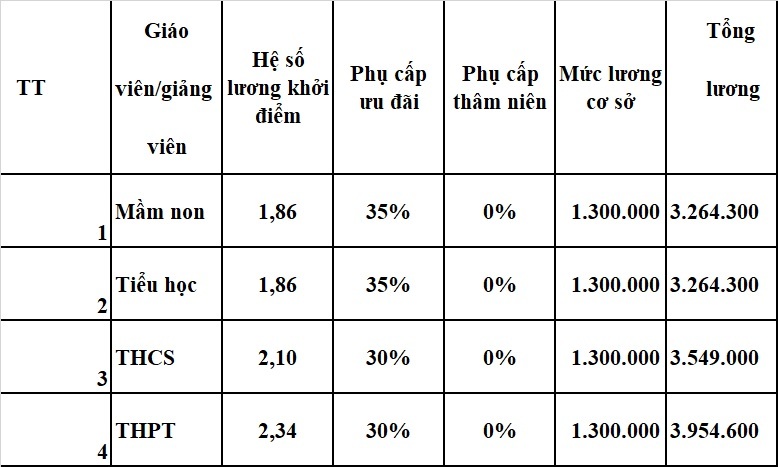 Giáo viên trung học phổ thông có hệ số lương khởi điểm là 2,34 (trình độ đại học), phụ cấp ưu đãi 30%, mức lương khởi điểm là 3.954.600.